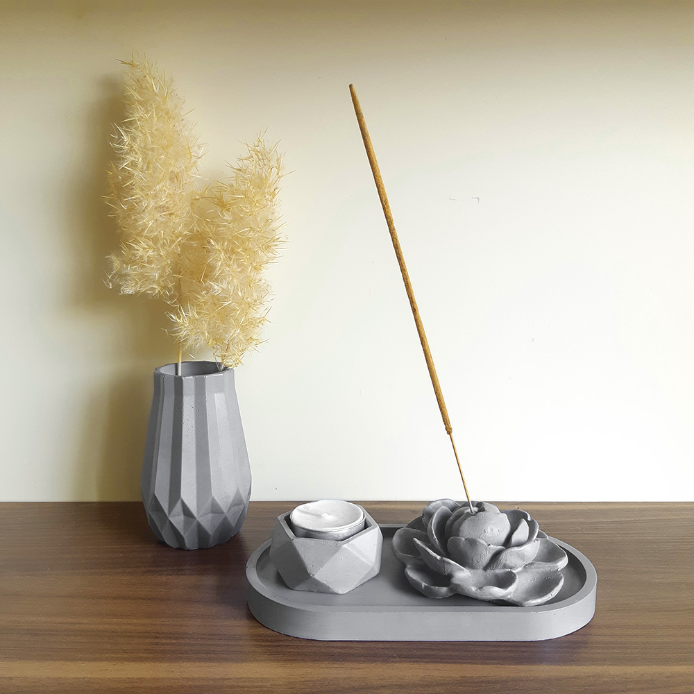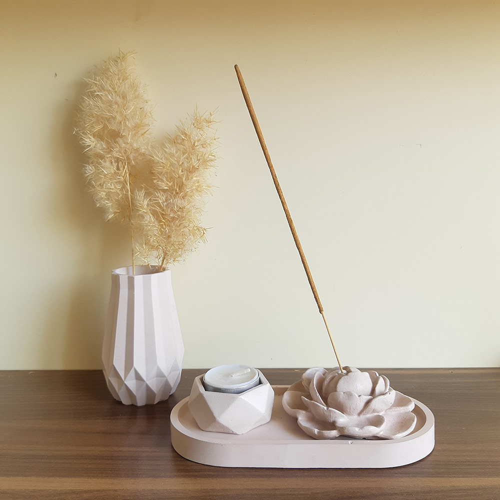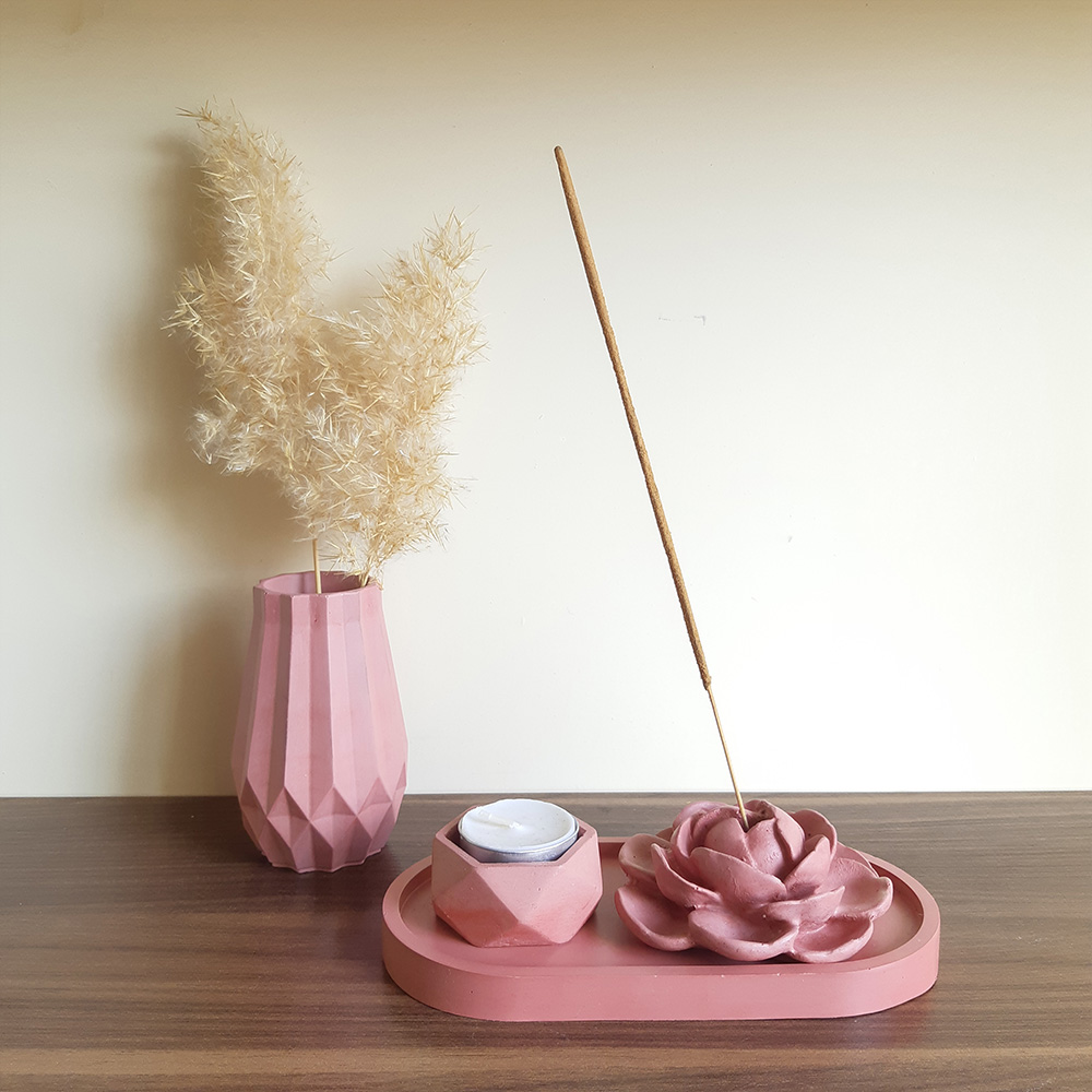 این ست ترکیبی از گلدان, جاعودی طرح گل، جاوارمری و زیره بیضی شکل می باشد. این محصول ساخته شده از بتن پلیمری بوده و برای میز عسلی مبلمان، میز تی وی، کانتر آشپزخانه، پاتختی سرویس خواب و همینطور استفاده در دفترکارتان مناسب است و به پیرامون شما زیبایی خاصی می بخشد. بدلیل طراحی ساده و دارا بودن رنگ های ملایم براحتی می تواند بر روی هر میز در هر سبک از طراحی دکوراسیون خود را جای دهد.