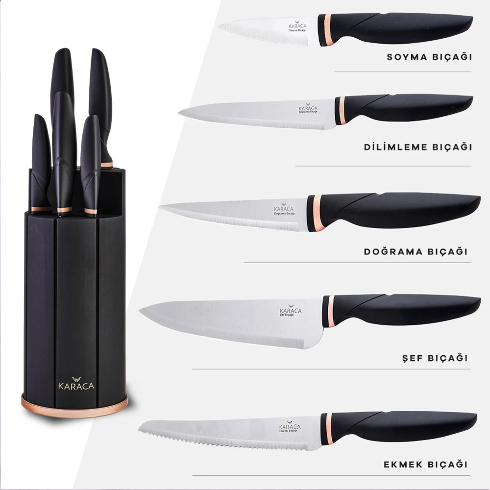 ما یک ست چاقو آشپزخانه بسیار شیک و بسیار کاربردی را به سرآشپزهای آشپزخانه پیشنهاد می کنیم. سرویس چاقو 6 پارچه کاراجا مدل Proofcut دارای 5 مدل چاقو کاربردی شامل چاقوهای پوست کن ، برش، خرد کن, نان و سرآشپز می باشد. که هر کدام زیباتر و تیزتر از دیگری هستند, این ست چاقو استیل که با کاربردی بودن خودنمایی می کند با دسته ارگونومیک و استفاده راحت یکی از محبوب ترین محصولات آشپزخانه شما خواهد بود. چاقوهای شما دارای یک پایه مخصوص ساخته شده از مواد لاستیکی به منظور افزایش طول عمر است.